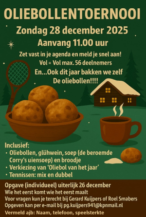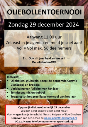 Het jaar zit er bijna op. Dat betekent dat het jaarlijkse, traditionele OLIEBOLLENTOERNOOI er weer aan komt! Zondag 29 december is het zo ver. Schrijf je snel in, want we hebben een beperkt aantal plekken.