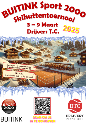 Doe jij ook mee aan het gezelligste open toernooi van de winter? Begin het jaar 2024 sportief door je in te schrijven voor het Buitink Sport 2000 Skihuttentoernooi van 26 februari t/m 3 maart bij Drijvers TC. Er wordt gespeeld in alle dubbelcategorieën 17+. Geef je snel op voor dinsdag 20 februari 18:00 uur!