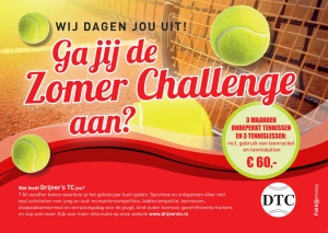 Ook dit jaar organiseert Drijver´s een Zomer Challenge voor iedereen die kennis wil maken met tennis. Drie maanden lekker sportief bezig zijn bij een leuke club inclusief drie lessen en gebruik van materialen voor weinig geld. Zegt het voort!